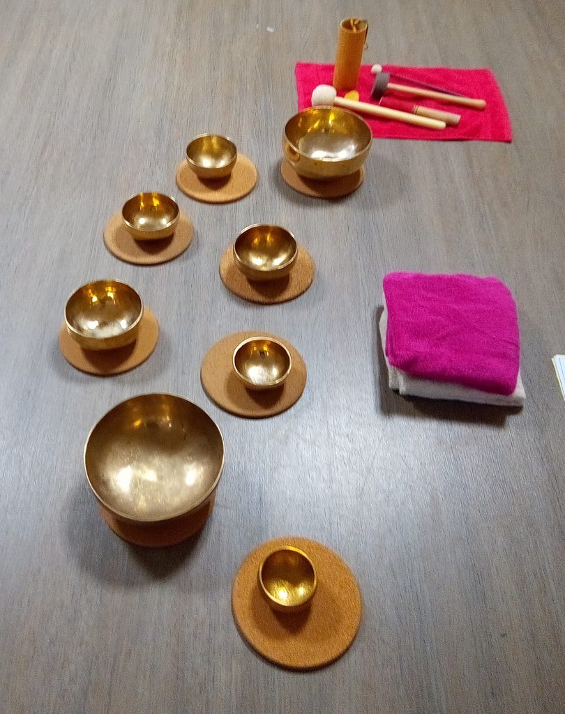 La séance est également constituée de méditation, elle est accompagnée des sons et vibrations des bols tibétains.